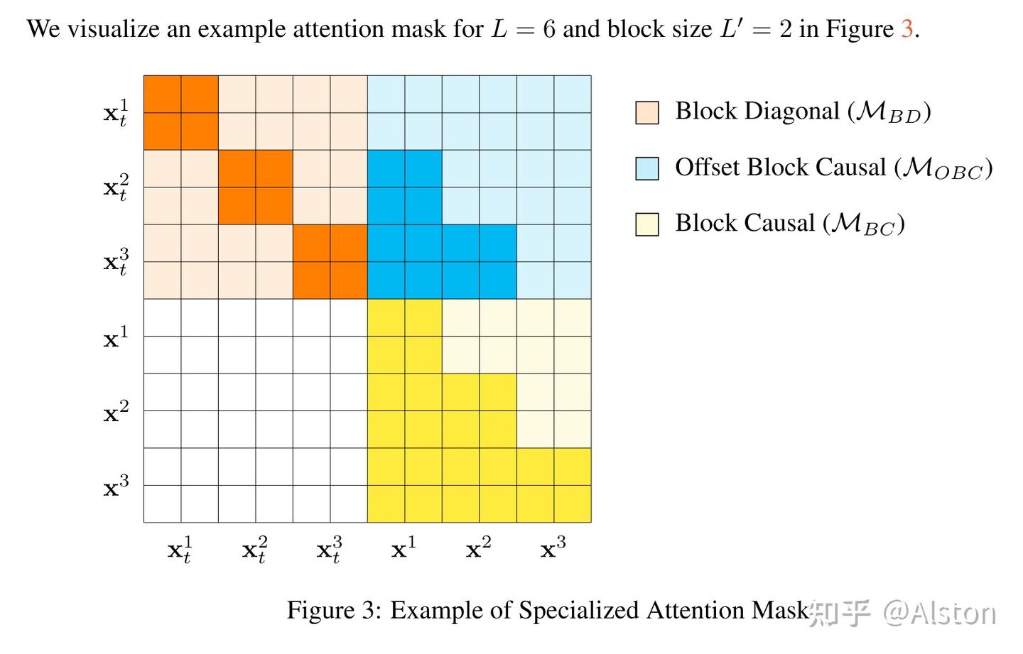 - Intra-block: Bidirectional attention (access to all tokens within the current block, including masked/suffix tokens in the same block).
